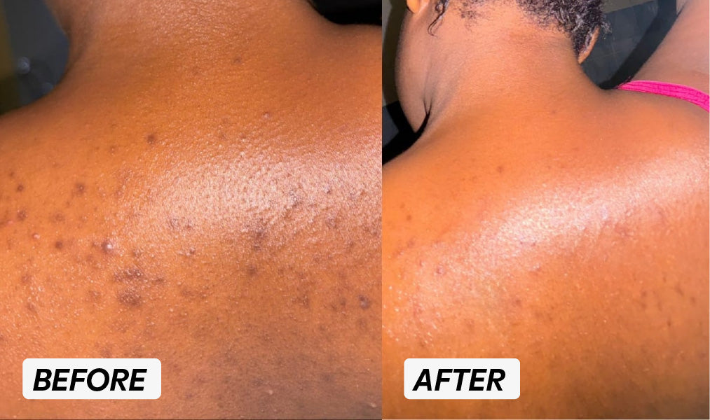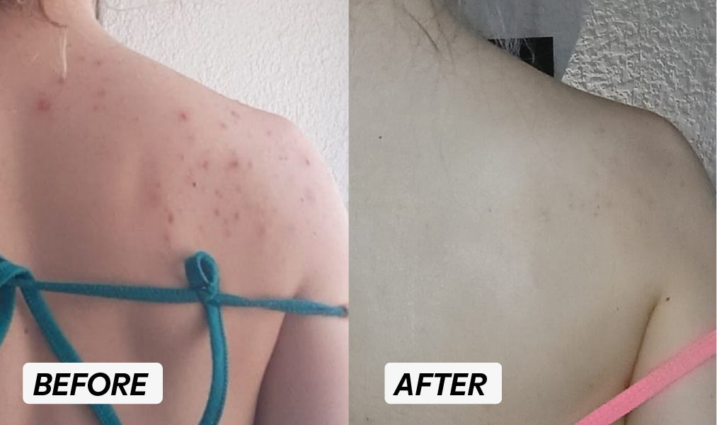 "I had terrible chest acne, bum spots and bacne.The inflammation went down in the first few days and in 2 weeks the scars faded. A few months in my skin is totally clear and glowing"