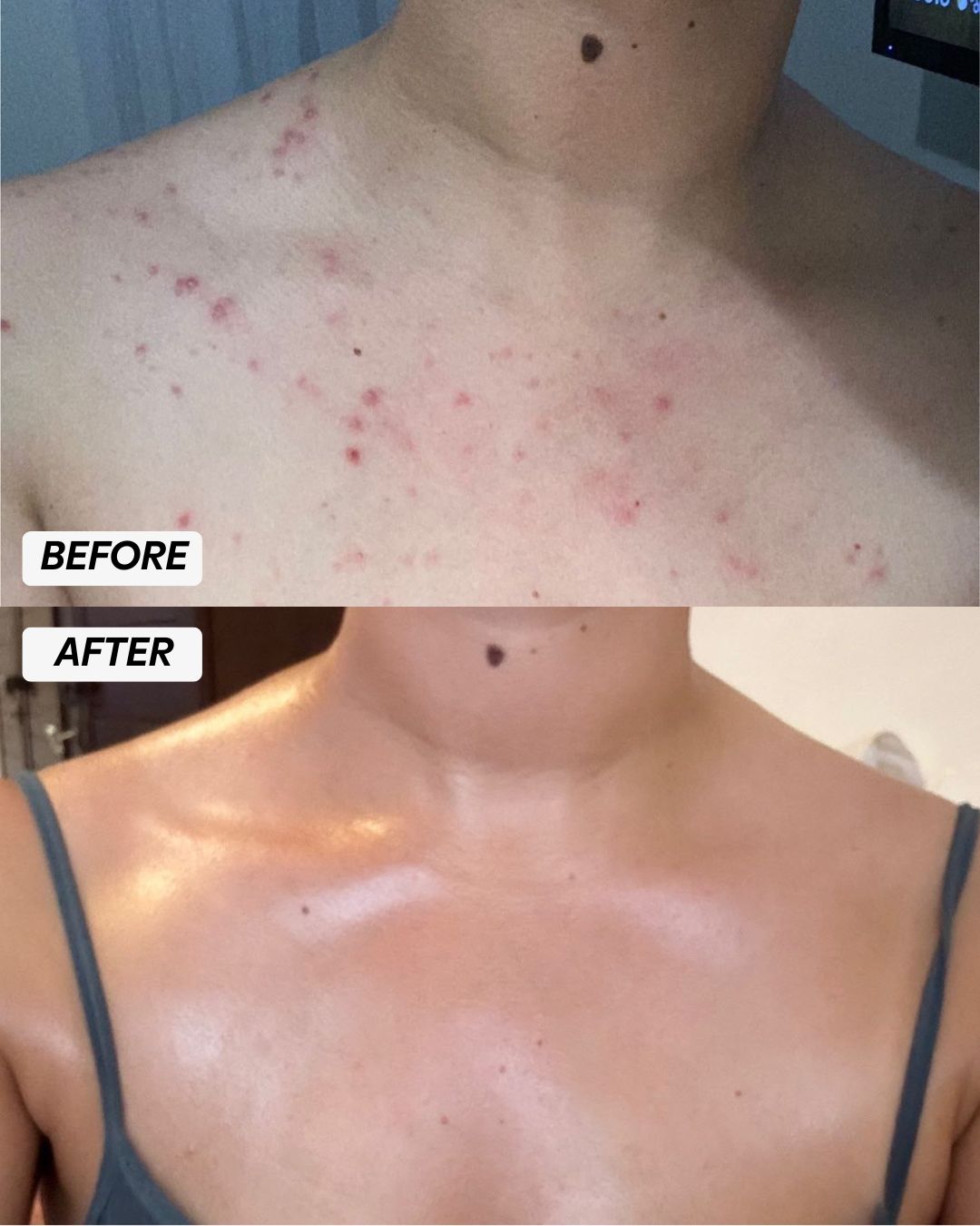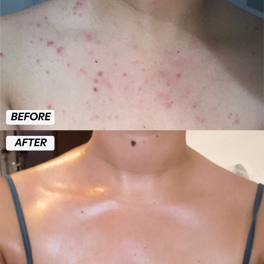 "I had terrible chest acne, bum spots and bacne.The inflammation went down in the first few days and in 2 weeks the scars faded. A few months in my skin is totally clear and glowing"