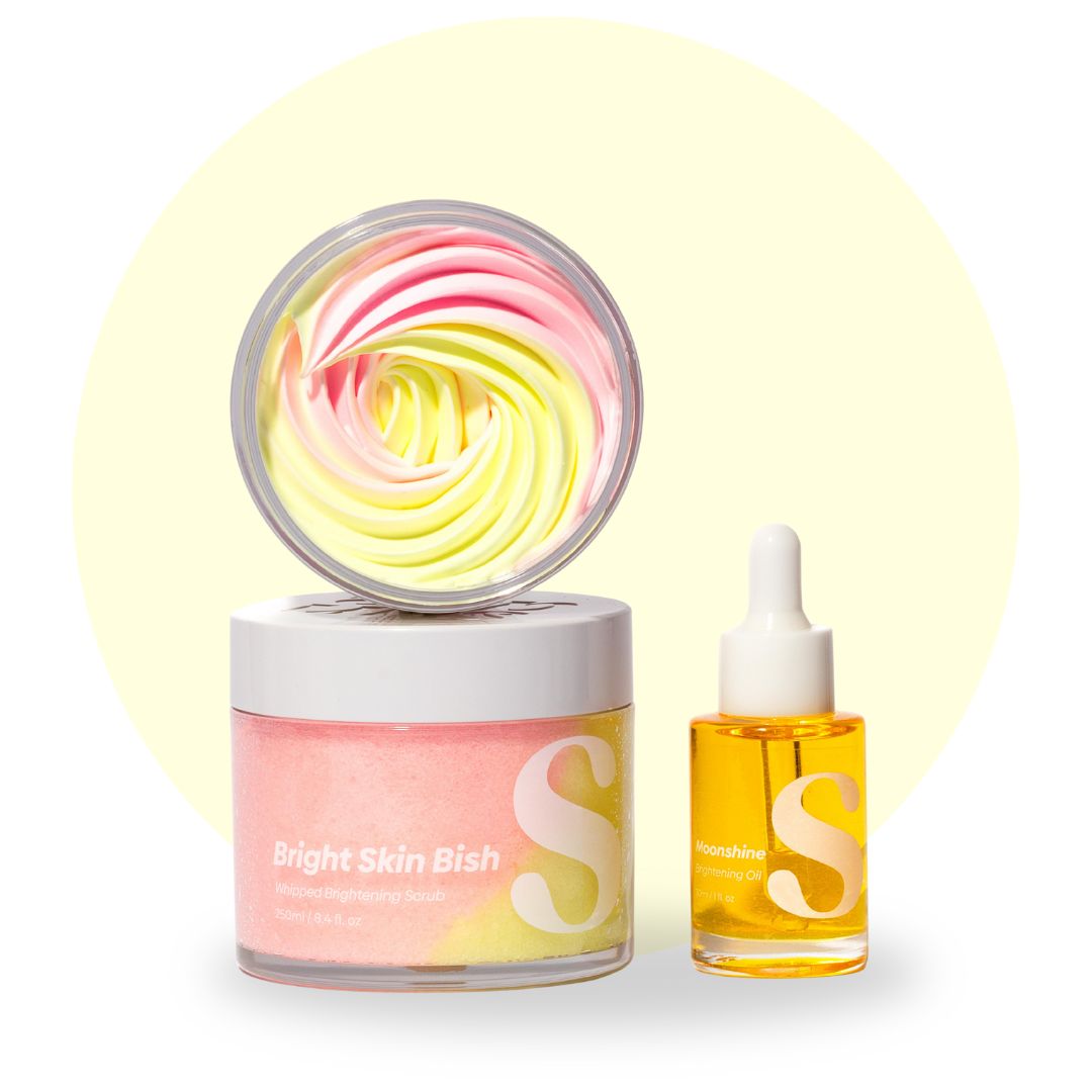 Step 1- Bright Skin Bish Scrub: Use 2–3x a week on wet skin, then rinse off