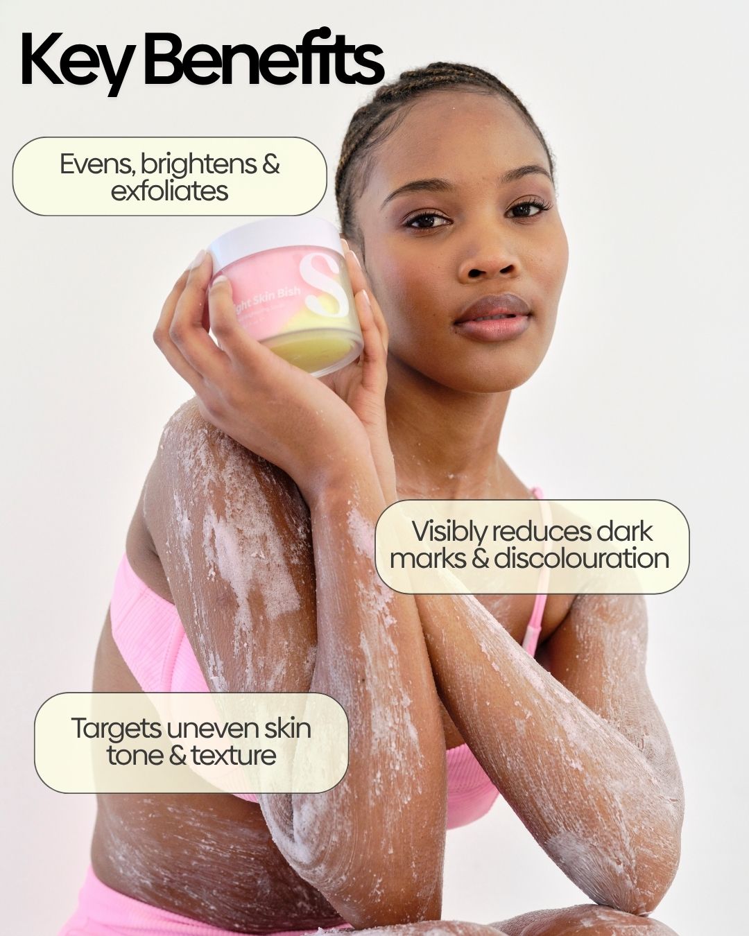 Use this gentle exfoliator 2/3 times a week in the shower to buff away dull, uneven skin. It clears the way so your skin can fully absorb the brightening ingredients that follow.