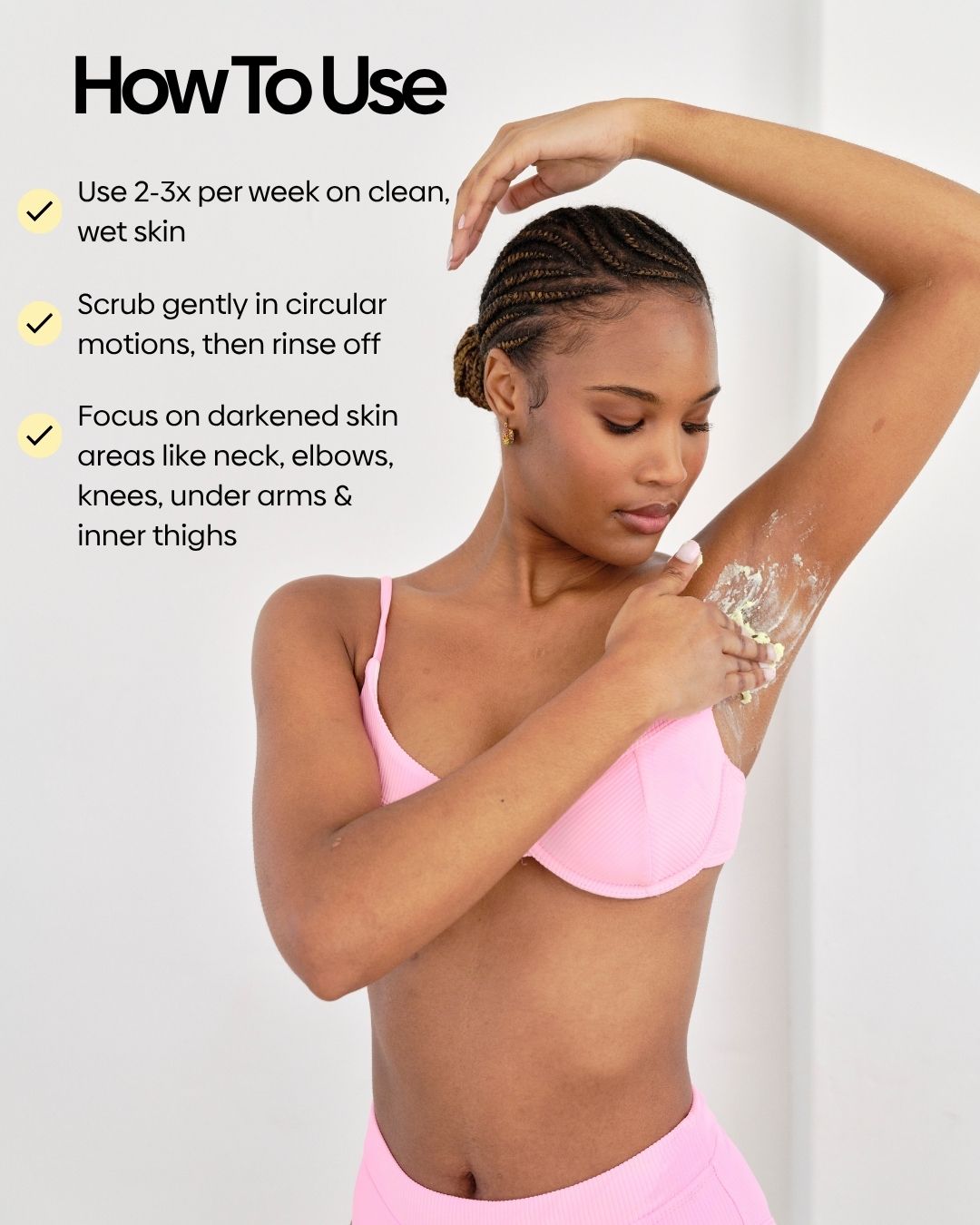 Focus on dark skin areas like neck, elbows, knees, underarms & inner thighs